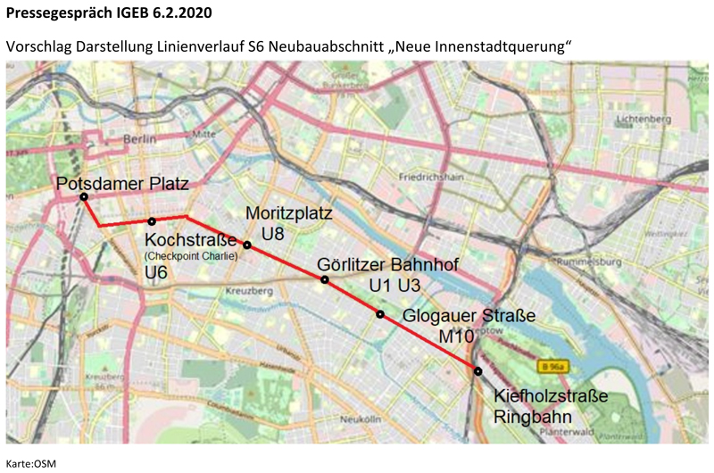 Visionär. Neu ist die Planung nicht. Schon im letzten Jahrhundert gab es Pläne, unter dem Straßenzug Kochstraße zum Görlitzer Bahnhof und weiter in Richtung Plänterwald einen S-Bahn-Tunnel bzw. eine S-Bahn-Strecke zu bauen. Damit könnte die Görlitzer Bahn, die als einzige Radialstrecke nicht direkt in die Berliner Innenstadt führt, sondern auf der die Züge auf dem Umweg über Ostkreuz zur Stadtbahn fahren (zurzeit die S9), „durchgebunden“ werden.